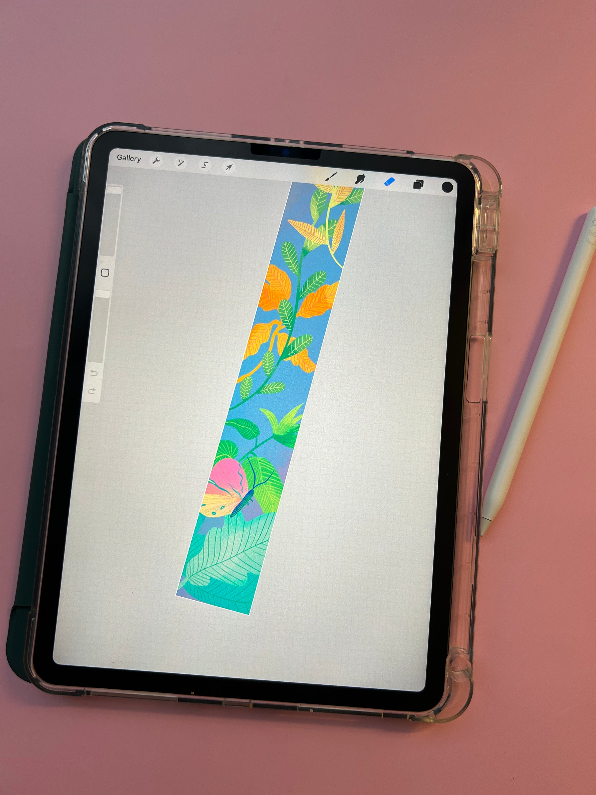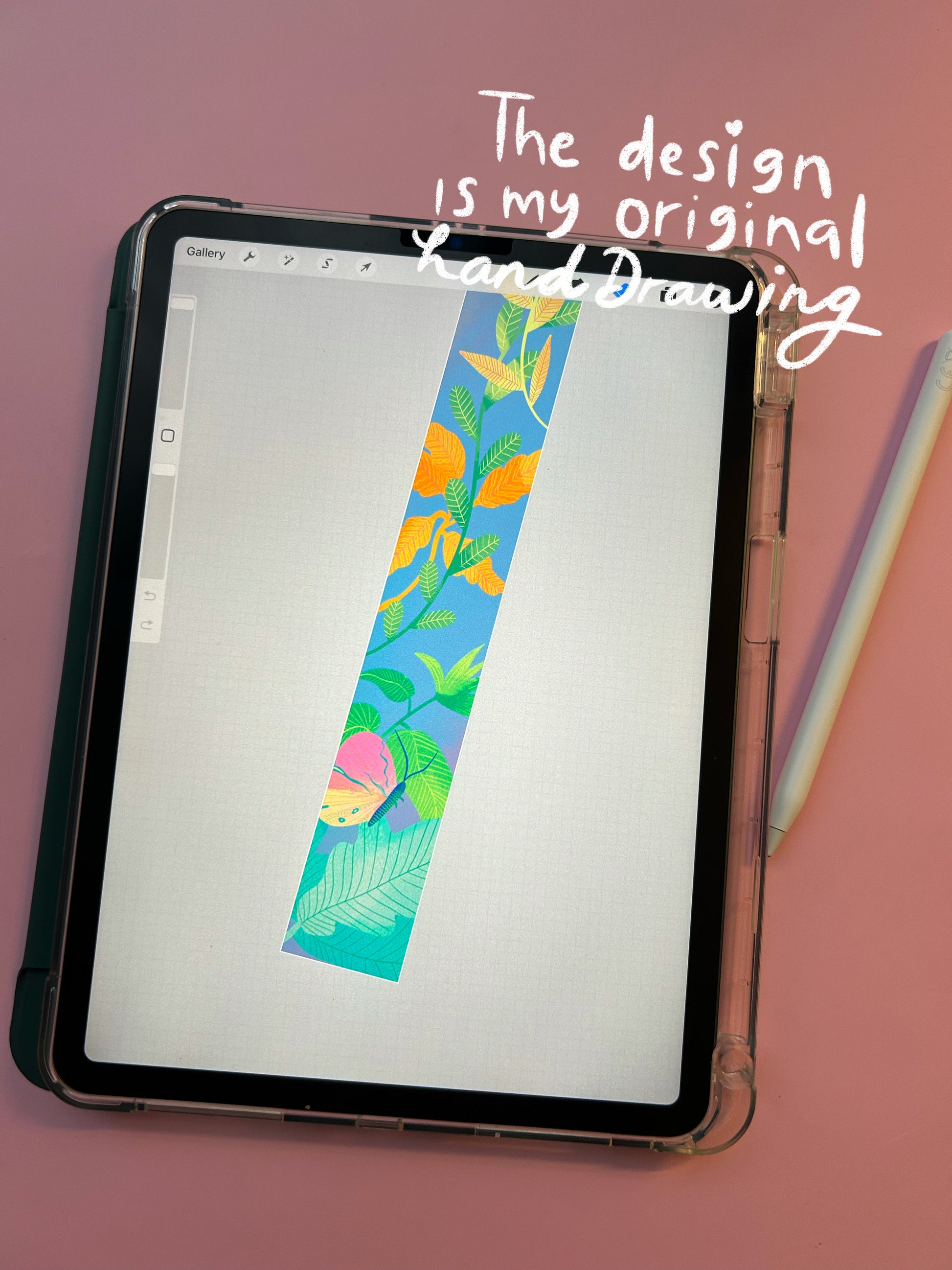 With fluttering leaves, delicate dots, and sun-washed hues of pink, orange, and sky blue, this piece feels like a stroll through a whimsical garden — where butterflies dance and everything is softly alive.